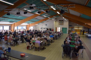 Après avoir ajouté deux ou trois tables supplémentaires, nous avons aligné 60 équipes soit 120 joueurs. L’année passée nous avions choisi de présenter en photo la salle avec les joueurs, cette année le choix est fait sur la préparation et le travail en coulisse des nombreux volontaires. En effet dès 8h00 du matin il faut réceptionner les lots de viande offerts à chaque joueur, installer le mobilier et préparer les tables, les jeux, les lots pour la tombola, la sono et la buvette. En début d’après-midi sont mises en place les diverses pâtisseries préparées par les épouses et les veuves de l’association. Merci à tous ceux qui ont permis une pleine réussite de cette journée.